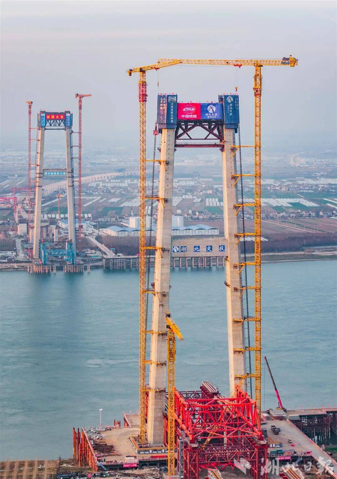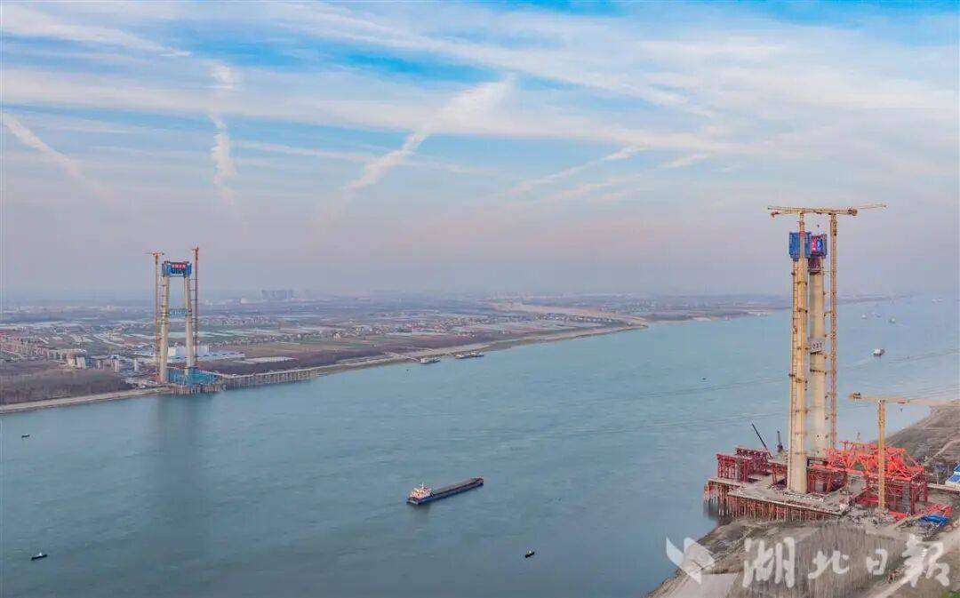 凛冽寒风中,站在荆州市荆州区江边,只见两座门式主塔巍然屹立于江边,作为未来大桥的“脊梁”,它们将承载起全长1723米、主跨达1120米的桥面。届时,汽车、高铁与城市车流将在约50米高空并行穿梭,蔚为壮观。