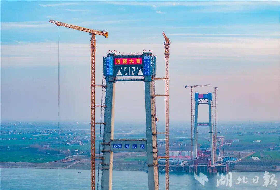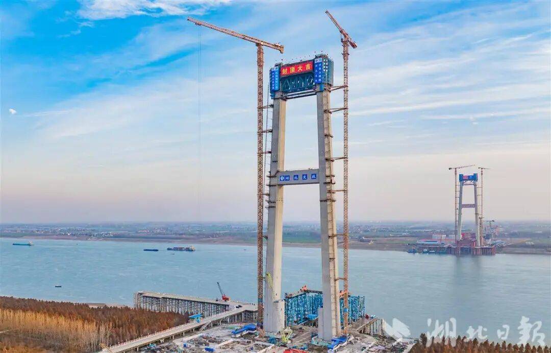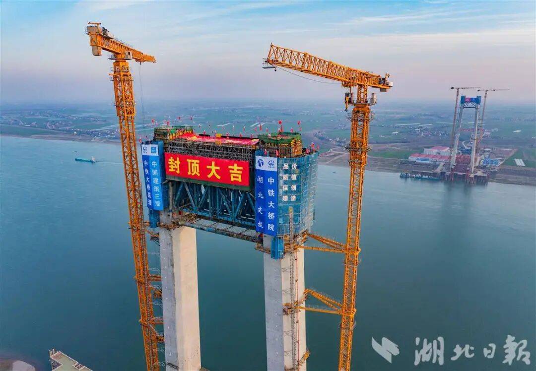2月9日,荆州李埠长江公铁大桥南北两岸主塔成功封顶,标志着这项世界级工程正式转入上部结构施工新阶段,建设全面提速。