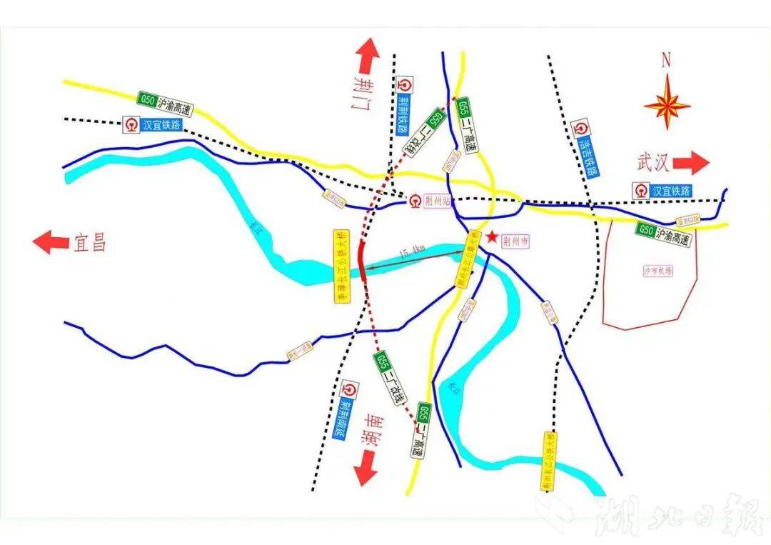 据了解,该大桥采用“一桥三用”分层设计。上层搭载二广高速改线,下层中间预留荆州至岳阳双线高速铁路,两侧为一级公路,兼顾城市交通功能。据介绍,大桥预计2027年5月份合龙,2028年建成通车。