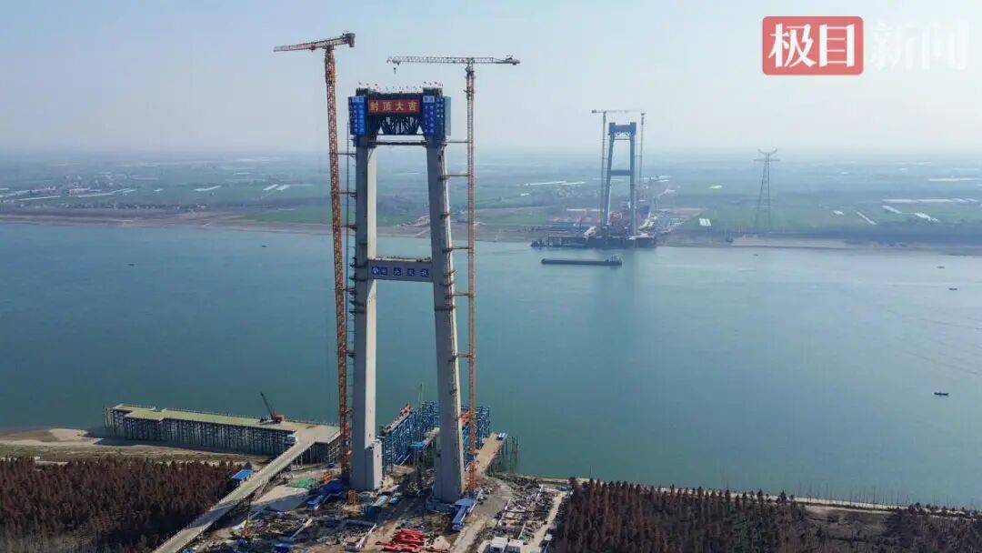 大桥两岸主塔均采用门型框架结构,北岸主塔高215.5米,南岸主塔高220.5米。作为未来大桥的“脊梁”,它们将通过无数根钢索,稳稳承载起全长1723米、主跨达1120米的桥面,让汽车、高铁在距江面50米高空并行穿梭。