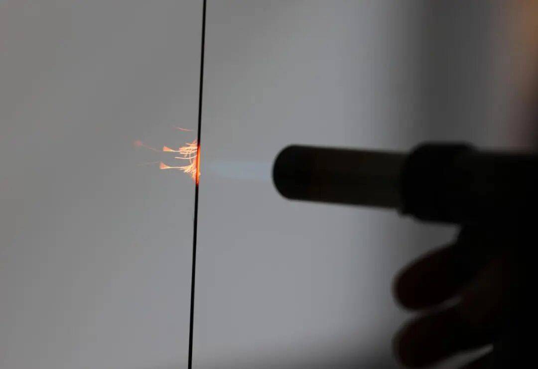 △ 1月10日,工人在山西省大同市一处实验室演示碳纤维耐火烧测试。 朱兴鑫 摄
