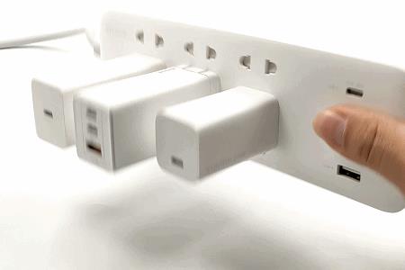 很多用户遇过某些插线板的夹持力度松松垮垮甚至接触不良,这里小编使用了三款重心偏高的条形充电器来测试紫米2A1C插线板夹持力,分别是小米氮化镓充电器、倍思氮化镓充电器、联想口红充电器。